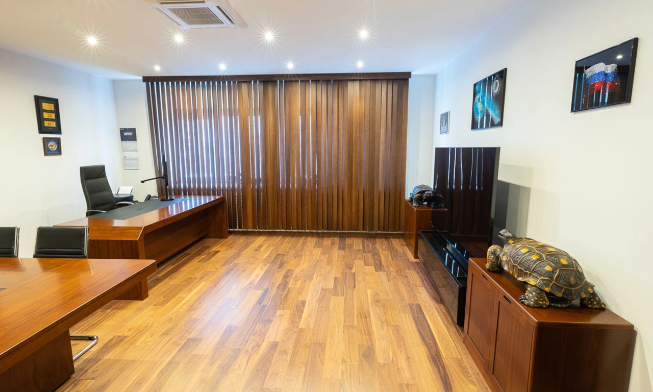 Недавно мы закончили проект по обустройству кабинета одного из руководителей компании. Работа началась с дизайн-проекта и плана расстановки мебели. В просторном помещении предстояло разместить большой рабочий стол, стол для переговоров на 4ых, зону хранения с гардеробом и найти место для кофемашины и холодильника.